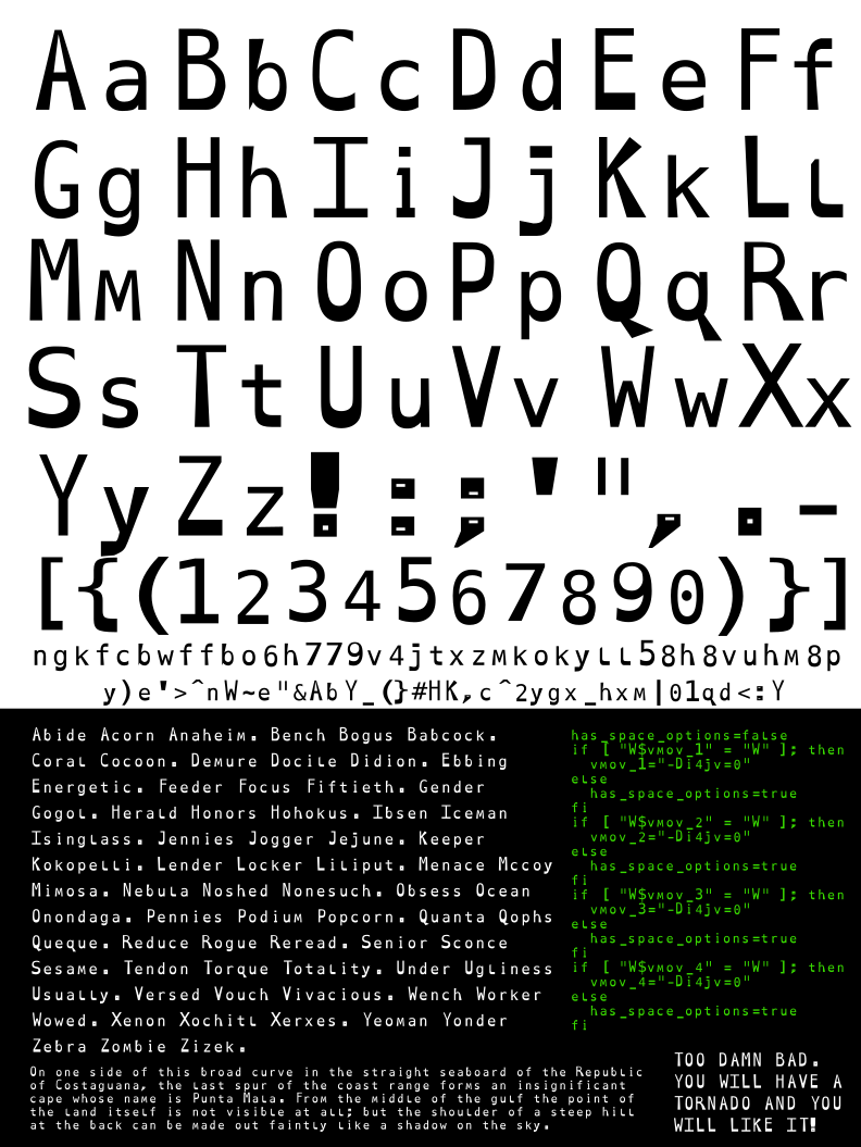 I made Dys Edit Mono when I was editing my book, looking for a font that help with proofing. I found the font DP Custom Mono, but it didn’t slap me in the face hard enough. I liked Open Dyslexic and thought the general idea was valid, so incorporated some of those forms into DP Custom Mono, and arrived at Dys Edit Mono. Although it does have a certain aesthetic quality, it most definitely is utilitarian. Please use it wisely.